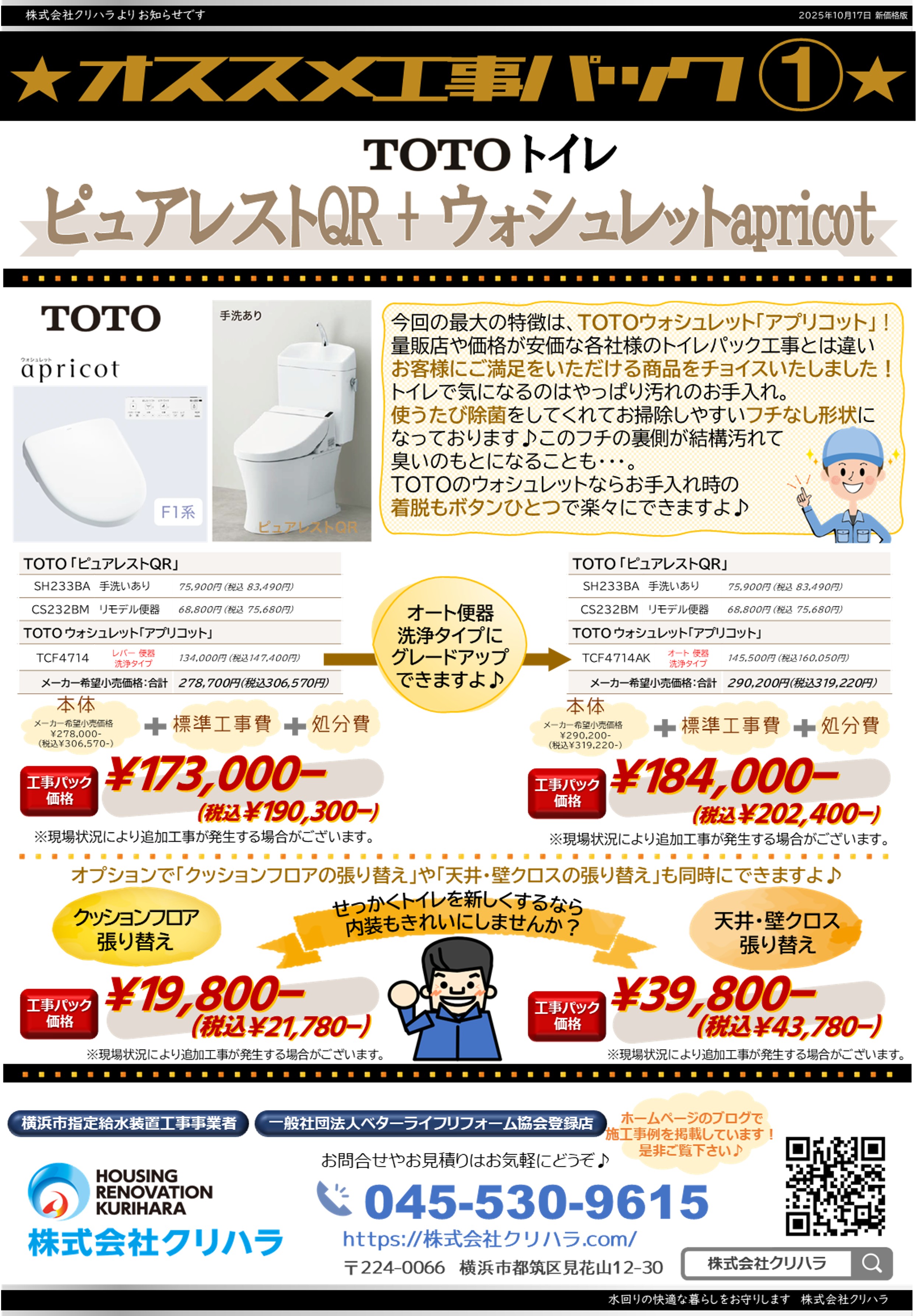 「オススメ工事パック① TOTOピュアレストQR+アプリコット」チラシ